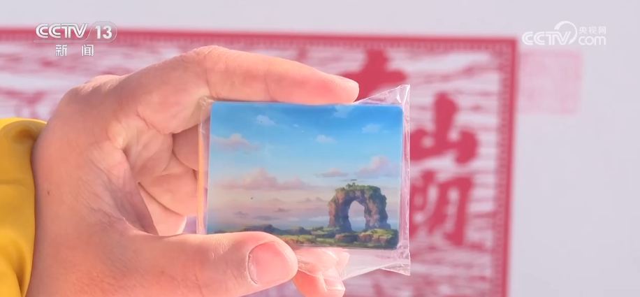这边陈列很多和长城元素相关的文创产品,有长城元素的剪纸,包括笔记本、冰箱贴、钥匙扣等。这里给大家重点介绍一款冰箱贴,这款冰箱贴呈现的元素就是“月亮门”,距离这里不远。它是长城的一处遗址,因为门洞形似满月,因而取名为“月亮门”,现在成了很多游客的打卡地。